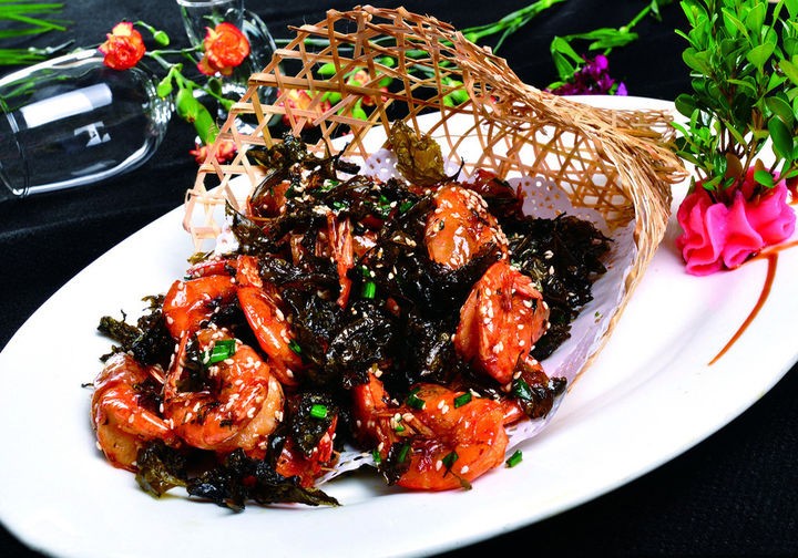 材料:黑虎蝦、茶葉做法:取黑虎蝦中段對剖穿透,頭尾保持完整,加鹽、料酒稍加腌製;將蝦尾從中間穿上、反卷,放入調好的汁中氽熟備用;將茶葉用開水漲開,晾幹置於五成油鍋中炸至香脆置於盤底;然後把造型好的蝦裝盤。